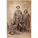 Studio portrait of three Aboriginal people dressed in animal skins, holding spears.