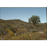Book caption: The more hilly country of the Badgingarra-Eneabba areas is developed on sandstones which produce poor sandy soils, and almost the whole of this country is covered with kwongan. Scattered small trees of Nuytsia floribunda, which flourish because they are robbing surrounding plants of moisture and nutrients, frequently stand isolated in low heathy kwongan. Acacias and smokebush (Conospermum) are in flower in this spring scene. Badgingarra.