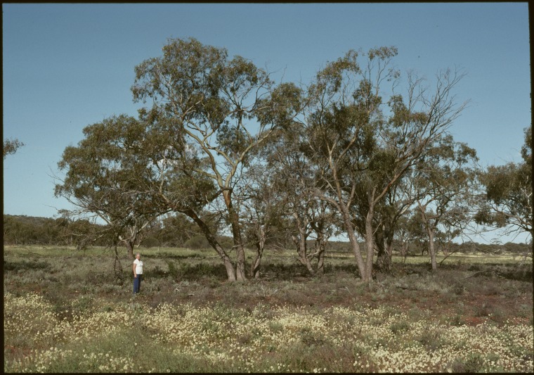Book caption: The occurrence of eucalypts in the country between Geraldton and the Murchison River is limited to occasional patches and individual trees of York gum (E. loxophleba) with a mainly herbaceous understorey of spring annuals, occupying deep moist soil. River red gum is also seen as individuals on hillsides occupying small drainage lines.