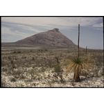Book caption: "One of the most interesting granite domes in the Cape Le Grand group is Frenchman Peak, whose curious overhanging top has a cave right through it from side to side. Although most of the mountain is bare granite there is a considerable flora in patches of soil and rubble clinging to the slopes. Leptospermum sericeum is common on and around the top. The sandplain which surrounds the mountains had been recently burnt at the time this photograph was taken. The blackboys are Xanthorrhoea gracilis."