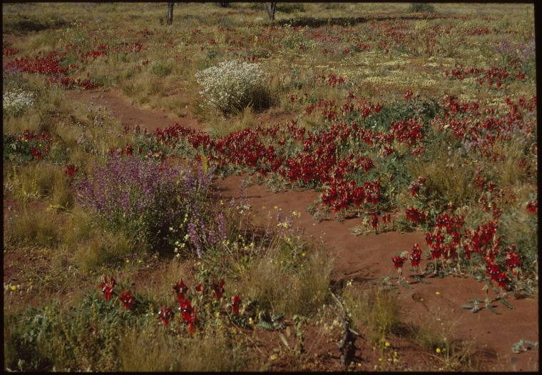 Book caption: "In the northern Eremaea displays of colour from wildflowers in good seasons may be seen between the spinifex or on loamy plains where mulga persists. However the Compositae give way to other species, the most famous being Sturt’s desert pea Clianthus formosus seen here in profusion. Also present are a purple pea-flowered Swainsona at left centre and a white Ptilotus obovatus in the background. Melrose station."