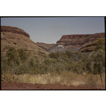 Book caption: The escarpment of the Hamersley Range rises to a general height of 900 m with a maximum of 1235 m at Mt Meharry on the plateau behind. The frontal escarpment is dissected by impressive gorges such as Dales and Wittenoom Gorges. The horizontally bedded rocks are extremely hard and consist of jaspilite and dolomite beds between which there are veins of blue asbestos. The view of Wittenoom Gorge here shows the asbestos mine which formerly operated here before the danger to health of this mineral was fully realised. Triodia wiseana on the slopes, river red gums, Eucalyptus camaldulensis, in the valley bottom.