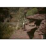 Book caption: Bee Gorge in the Hamersley Range. Paperbarks and reeds contrast with the bare cliffs. Pieces of the rock are so hard that they are like iron plate.