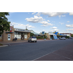 Notes provided by photographer: The Station opened in 2015, a community centre with tourist office and faclities for functions, training and arts; Wongan Hills Bakery & Cafe, ANZ Bank, butcher Wongan Hills Family Meats and Betta Home Living store and other shops on Fenton Place. In the foreground a man in a mobility scooter uses at ATM; The art deco Wongan Hills Civic Hotel corner of Fenton Place and Quinlan St; Wongan Hills Sporting Pavilion next to the oval.