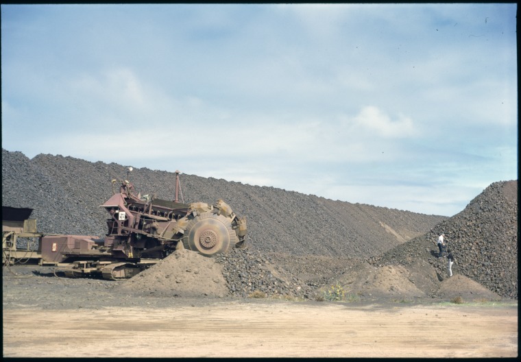 Title devised by cataloguer. Written on slide mount for 144850PD: Oh my teeth! (mechanical shovel for iron ore handling, Geraldton) 15/4/68; on mount for 144851PD: Part of mechanical shovel handling iron ore 15/4/68; on mount for 144852PD: Iron ore Geraldton Wharf (note mechanical shovel) 15/4/68.