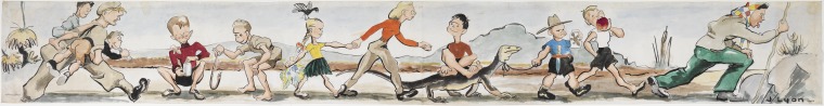 Caricature of an Western Australian Naturalists' Club excursion, painted by club member Joy Lyon on a single long banner. The man on the extreme left has been identified as Harry Butler, the woman on the extreme right as Lucia Serventy, the boy in glasses as Rob Lyon, and the girl being led by the hand as Judith Lyon. The remaining woman remains unidentified.