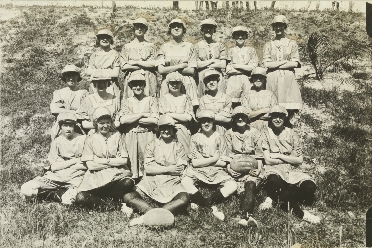 BA2743/5: Group portrait of combined Boans and Foy and Gibson team at ladies football match against Maylands-Norwood, 1921.
