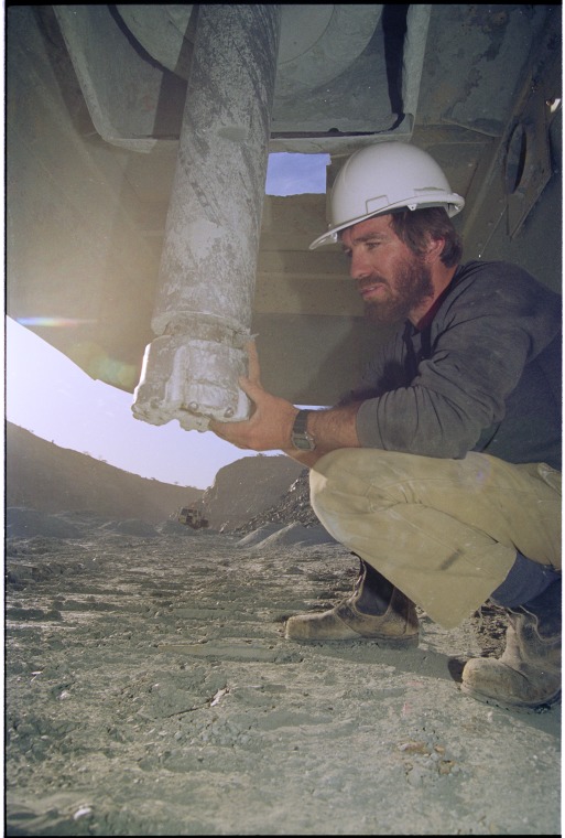 370536PD: Brandrill employee checking drill bit at the New Celebration Gold Mine, Kalgoorlie, 13 August 1993