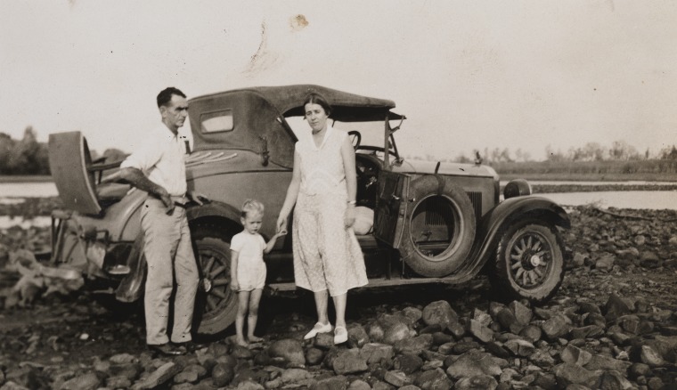 BA1410/3/47: Alan Sloan with John and his wife Amy at the Ord River, 1933?