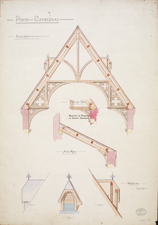 ACC 9592AD/9.11: Perth Cathedral, St. Georges Terrace : plan of aisle roof, principal truss; ventilator (1881)