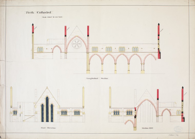 ACC 9592AD/9.10: Perth Cathedral, St. Georges Terrace : longitudinal section; east elevation; section A.A [1880?]