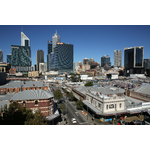 Photograph taken from the roof deck of the Alex Hotel on the north east corner of James and William Streets, Perth. The new Perth Busport is seen as the three white structures which are the (left-right) William St, Queen St and King St entrances to the underground bus station. William Street is the suburb boundary with Perth to the left and Northbridge to the right, but Perth on the southern side of the railway line.