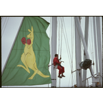 In 1983 the boxing kangaroo received national and international prominence when it served as the symbol for the successful Australian challenge for the America's Cup, where the boxing kangaroo flag, a red-gloved golden kangaroo on a green background, was flown from the yacht Australia II. Alan Bond (owner of the Australia II yacht) owned the image and licensed it for mass production. The image was later bought by the Australian Olympic Committee, and is used as a mascot to represent the Australian Olympic team and to promote sport and fair play in schools (Wikipedia 2016)