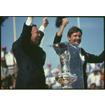 146948PD: Alan Bond (left) and John Bertrand with the America's Cup during Australia II Day celebrations on The Espanade, Perth, 30 October 1983