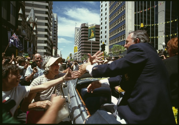 146947PD: Alan Bond shaking hands during the Australia II Day parade in St Georges Terrace, Perth, 30 October 1983