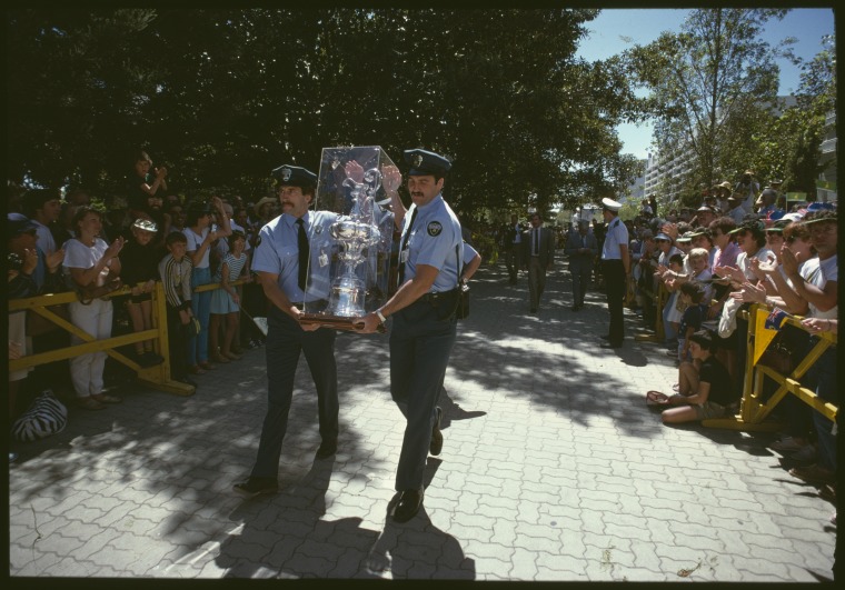 146949PD: Security guards carry the America's Cup trophy onto The Esplanade during the Australia II Day celebrations, Perth, 30 October 1983
