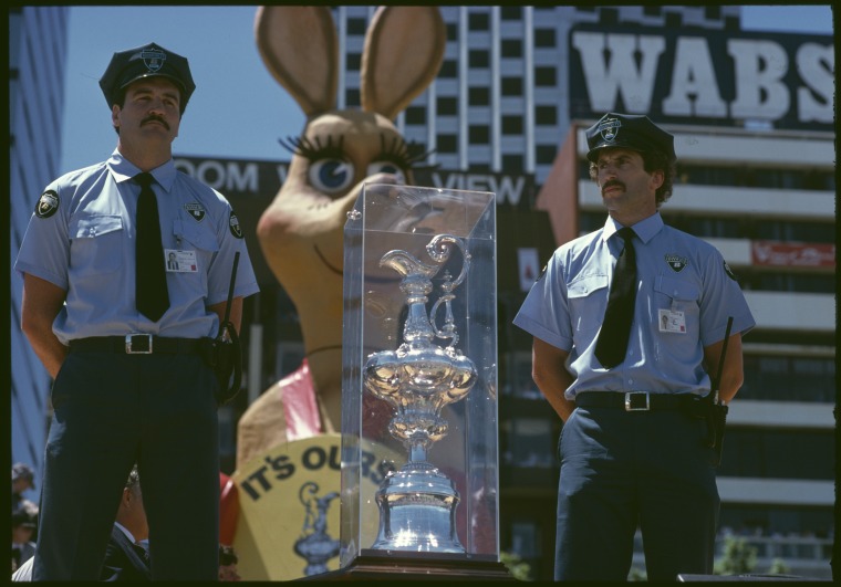 146950PD: Security guards with the America's Cup trophy on The Esplanade during the Australia II Day celebrations, Perth, 30 October 1983