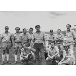 Peter Wherrett teaches defensive driving at Tom Price. L-R Standing: Peter Corti (Liaison Officer - Paraburdoo), Kerry Gardiner (Senior Supply Officer - Paraburdoo), Les Stackpoole (Tractor Operator - Tom Price), Clem Thompson (Foreman Mine Management - Tom Price), Peter Wherrett, Beau Broomhall (Foreman Mine Maintenance - Tom Price), John Arbuckle (Mechanical Foreman Mine Maintenance - Tom Price), Roger Weston (Storeman Supply - Tom Price); Kneeling: Sandy Knox (Surveyor Mine Production - Tom Price), John Drury (Truck Instructor Mine Production - Tom Price), W.K. 'Wild Bill' Tucker (Instructor Mobile Equipment - Tom Price)