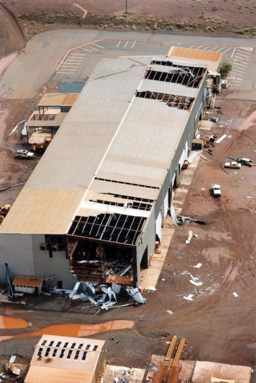 Photographs of the interior and exterior of the damaged Pannawonica Medical Centre; Pannawonica Sports Club; Pannawonica Community Hall used as a cyclone shelter; the screen flattened at the Pannawonica Picture Gardens; workshops; Mesa j waterlogged; damaged houses in Maitland Street; Chris Costello in the ruins of his home (the Costello family were the first to receive a new home, built on the first site six months later); bowing to the elements, one of the two dozen power pylons destroyed by high winds.