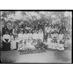 Left to right back: Unknown, unknown, William Henry (Bill) Fricker (b.1880), unknown, Charles Latham, John Pinker, Fred Nobles (b.1860); centre: Mr Meads, Andrew Stewart senior (b.1861), unknown, James Patrick Butler, Andrew (Andy) Stewart junior (b.1884), Joseph Harold (Joe) Currell (best man), Alexander (Albert) Stewart (b.1893), J.T. Smith, Edward Patrick (Paddy) Cusack (b.1878), unknown, George Nobles (b.1899); front: Mrs Meads, Louisa Maria Latham, Helena Nobles (b.1869), Rhoda Stewart (b.1857), Mrs Savage, Mrs Ethel May Pinker, Miss Lilly Pinker (bridesmaid), Mary Hilton nee Hitchcock (bride), Randolph Hilton (groom), Miss Milly Pinker, Mary Elizabeth (Molly) Cusack (b.1884), Miss Cairns, Annie Fricker (b.1884)