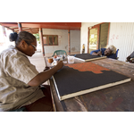 BA2840/272: Lena Nyadbi (left), Jodie Hall (right) with Phyllis Ningarmara in the background painting their Barramundi Dreaming. These women are the only three owners of the Barramundi Dreaming. Waringarri Aboriginal Arts Centre, Kununurra, 5 September 20