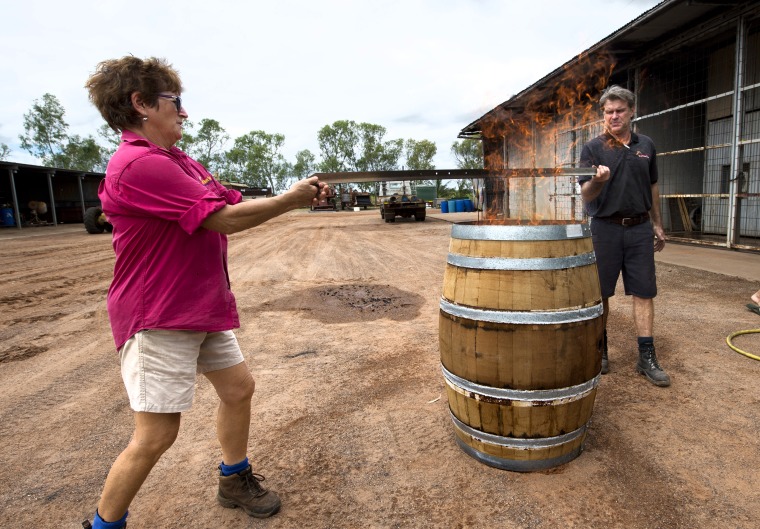 BA2840/316: Distillers Margaret Lyons and Luke Parker charring the inside of an oak barrel to add colour and flavour to Hoochery rum, 13 April 2017