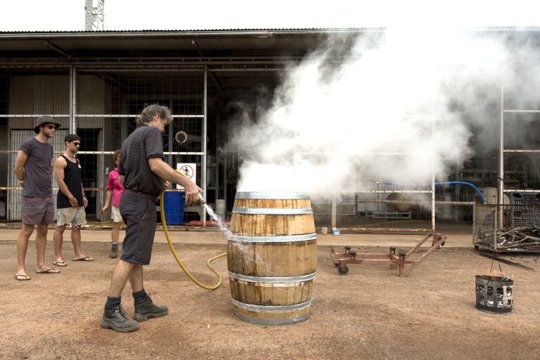 BA2840/323: Luke Parker hosing down a barrel after charring the inside of it at the Hoochery Distillery, Kununurra, 13 April 2017