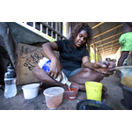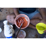 BA2840/369: Desiree Simon mixing ochre with wood glue ready for painting, Mirima, Kununurra, 19 August 2017