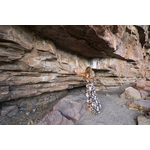 BA2840/438: Along this ledge the rocks are smooth to touch. Rebecca Longstaff looking at the Aboriginal art on the rock at Moochalabra Dam near Wyndham, 29 August 2017