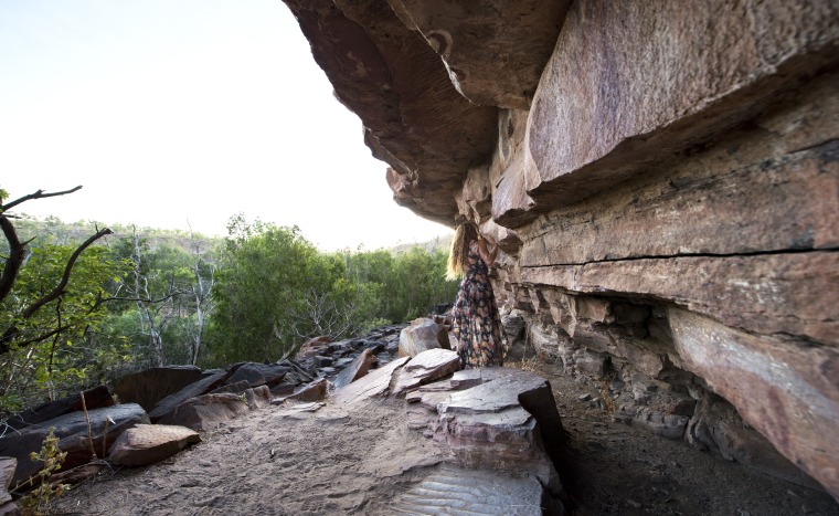 BA2840/437: Rebecca Longstaff exploring the ledge at Moochalabra Dam near Wyndham, 29 August 2017