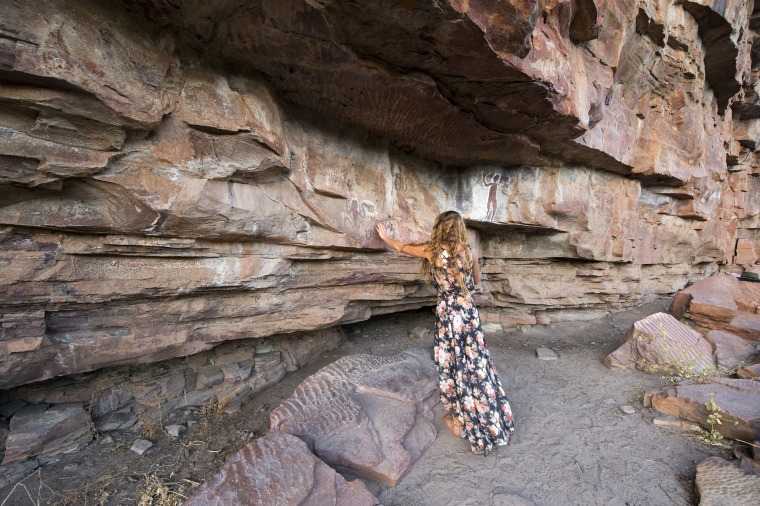 BA2840/439: Rebecca Longstaff looking at the Aboriginal art on the rock at Moochalabra Dam near Wyndham, 29 August 2017