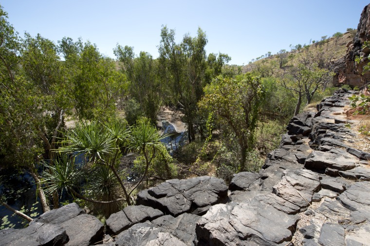 BA2840/440: Looking over the rock ledge to the river below, Moochalabra Dam near Wyndham, 29 August 2017