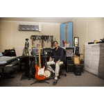 Hank Marvin in his Northbridge recording studio with guitars, including the red Hank Marvin Fender Stratocaster. Some of his favorite and most meaning full items in background - (L-R) - a bronze statuette from France, a small frame with his HIgh School blazer crest, photo of he and son Ben performing live, Gold disc awarded for his 'Hank Palys Cliff ' CD, and the brass 'American Society of Composers, Authors and Publishers' Award of Merit for 'Sam' a song he co-wrote in 1977. Photographed for the Daily Maily Weekend Magazine (UK), 20th May 2017, by Philip Gostelow. - Hank Brian Marvin (born Brian Robson Rankin, 28 October 1941) is an English multi-instrumentalist, vocalist and songwriter now living in Perth, Western Australia. He is best known as the lead guitarist for the Shadows, a group which primarily performed instrumentals and was the backing band for Cliff Richard and subsequently for Marvin, Welch & Farrar. Many leading British and Canadian rock guitarists cite Marvin as an influence. (Wikipedia 2017)
