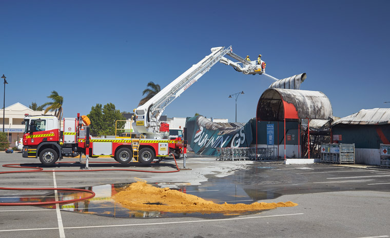 BA2932/4: The fire brigade pumps water into the building from an aerial platform, 27 February 2018