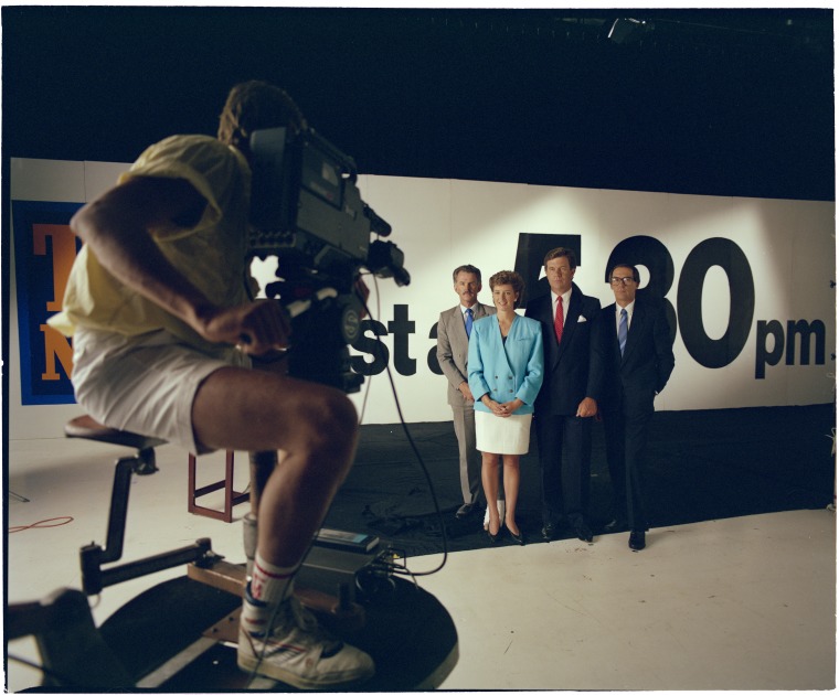 News and weather presenters: Left-right: Ian Brayshaw, Gina Pickering, Greg Pearce, John Barnett. Channel Ten made its first broadcast from its Dianella studios in 1988.