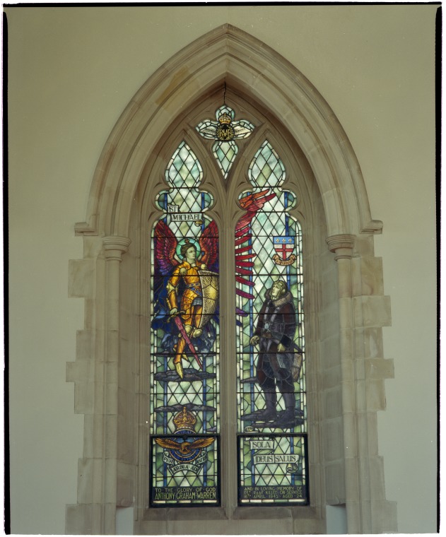 384168PD: Stained glass window in the Chapel of St Mary and St George, Guildford Grammar School, September 1991