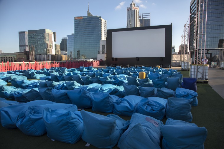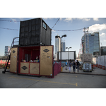 Rooftop Movies, outdoor/open air cinema, on the top level of the Roe Street multi-storey car park. Perth’s first rooftop cinema, is open during Perth’s summer months and screens a variety of films from cult classics to recent releases. It is run by the producers of Fringe World Festival in conjunction with City of Perth Parking. It has it's own bar and snack bar (housed in a converted sea-container), a pizza counter and a old 1960s caravan with side removed to create an open seating arrangement for patrons. Photographed 22 February 2018, by Philip Gostelow
