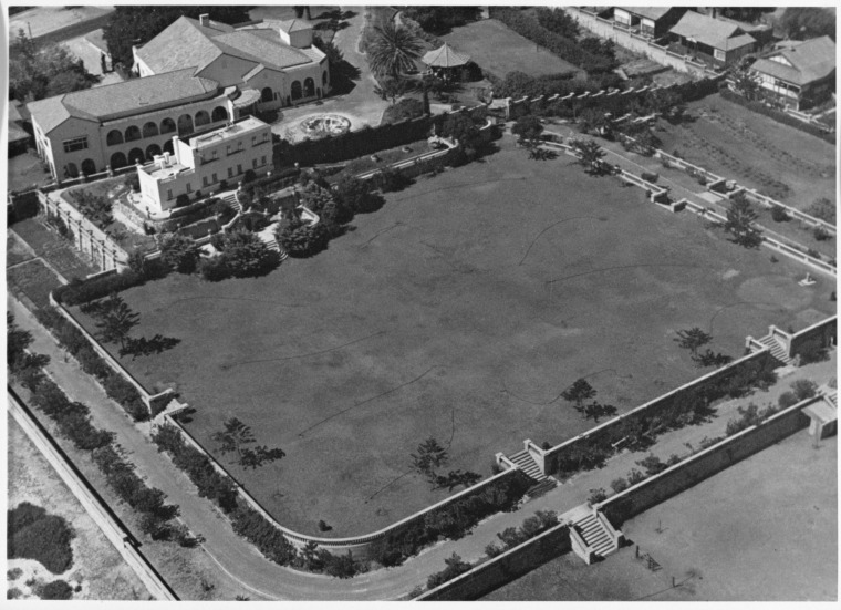 383018PD: Aerial view of Overton Lodge showing large lawn area and garden, Cottesloe, Western Australia, ca. 1945.