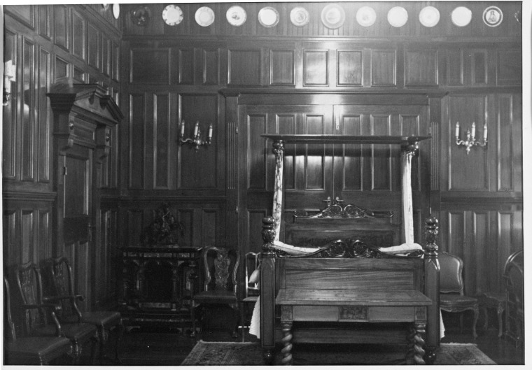 383033PD: Wood panelled bedroom, Overton Lodge, Cottesloe, Western Australia, ca. 1945.