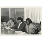 BA863/95: Duncan Lamont and two council members of the Nyangganambi Community at a Department of Aboriginal Affairs meeting in progress, possibly at their Geraldton offices, Western Australia, 1976?