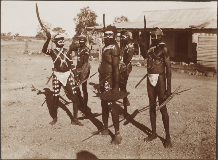 3771B/21: Five Aboriginal Australian men in body pain with spears, boomerangs and shields, possibly Njamal people on Corunna Downs Station, Western Australia, ca. 1930?
