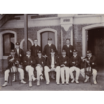 The English cricket team. L-R: Sitting: J. Humphries, S.F. Barnes, L.C. Braund, A.O. Jones, F.L. Fane, W. Rhodes, E.G. Hayes; Standing: J. Hardstaff, C. Blythe, J.N. Crawford, R.A. Young.