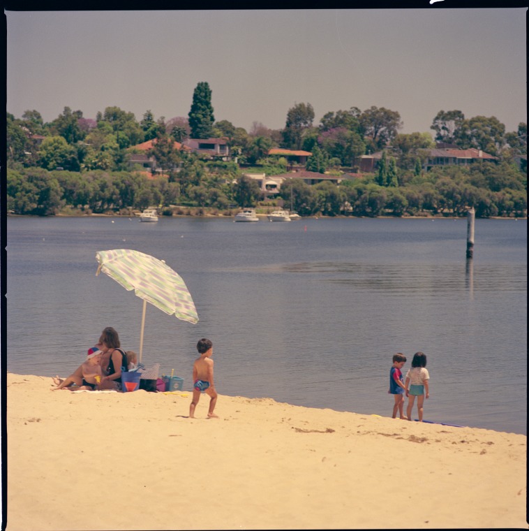 390703PD: A family enjoy the beach on the Canning River at Deep Water Point Reserve, Mt Pleasant, 5 December 1989