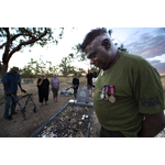 The photographer attends a small gathering at Warmun Cemetery on Anzac Day remembering Aboriginal ex-servicemen including David Turner, Jimbo Johnson and Hector Jandany. NOTE: The photographs showing Hector Jandany's grave show that his name is incorrectly spelled Jandan on his gravestone. Hector Jandany (1929-2006) was a well known Aboriginal artist and ex-serviceman. Those present at the cemetery include artists Gabriel Nodea and his brother Mark who proudly wear medals awarded to them the week before Anzac Day for their service in Norforce.