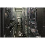 Photographer's notes: BA2493/2412: Dispensary within the Pharmacy, ground floor level. The image shows chutes on counter - Prescription drugs are loaded into the robot until such time as they’re needed to be dispensed at which time they come down the chute BA2493/2413: Dispensary robot within the Pharmacy, ground floor level. View inside the dispensary robot, showing rows of packaged prescription drugs on either side of corridor and the robotic arms (2) which select and dispense the selected drugs.