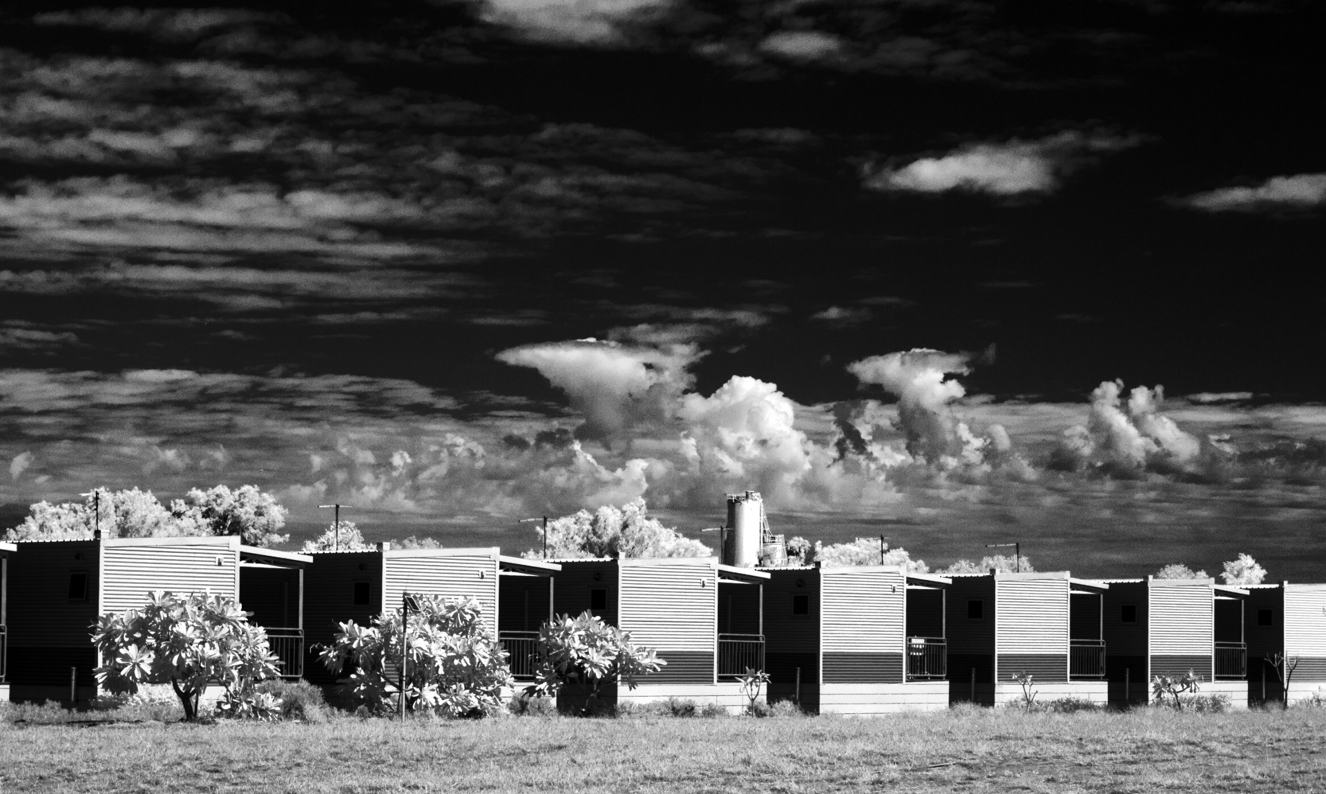 Photographs of the workforce accommodation park used by fly-in fly-out (FIFO) construction workers on the Chevron Wheatstone Project natural gas hub at Onslow. Named "Discovery Parks - Onslow' by the owners of the park it can accommodate 480 people. While the photographer was staying in the park some accommodation units (known as dongas) were removed for transporting to Bunbury where a new employment project in getting under way. Located at 557 Beadon Creek Road, Onslow.