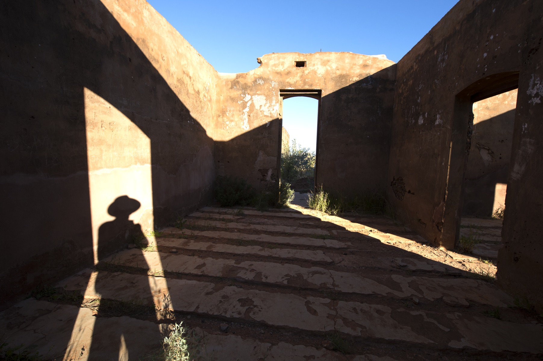 BA2840/1367: The shadow of the photographer in the Rob Roy Hotel at the old Onslow townsite, 15 August 2019