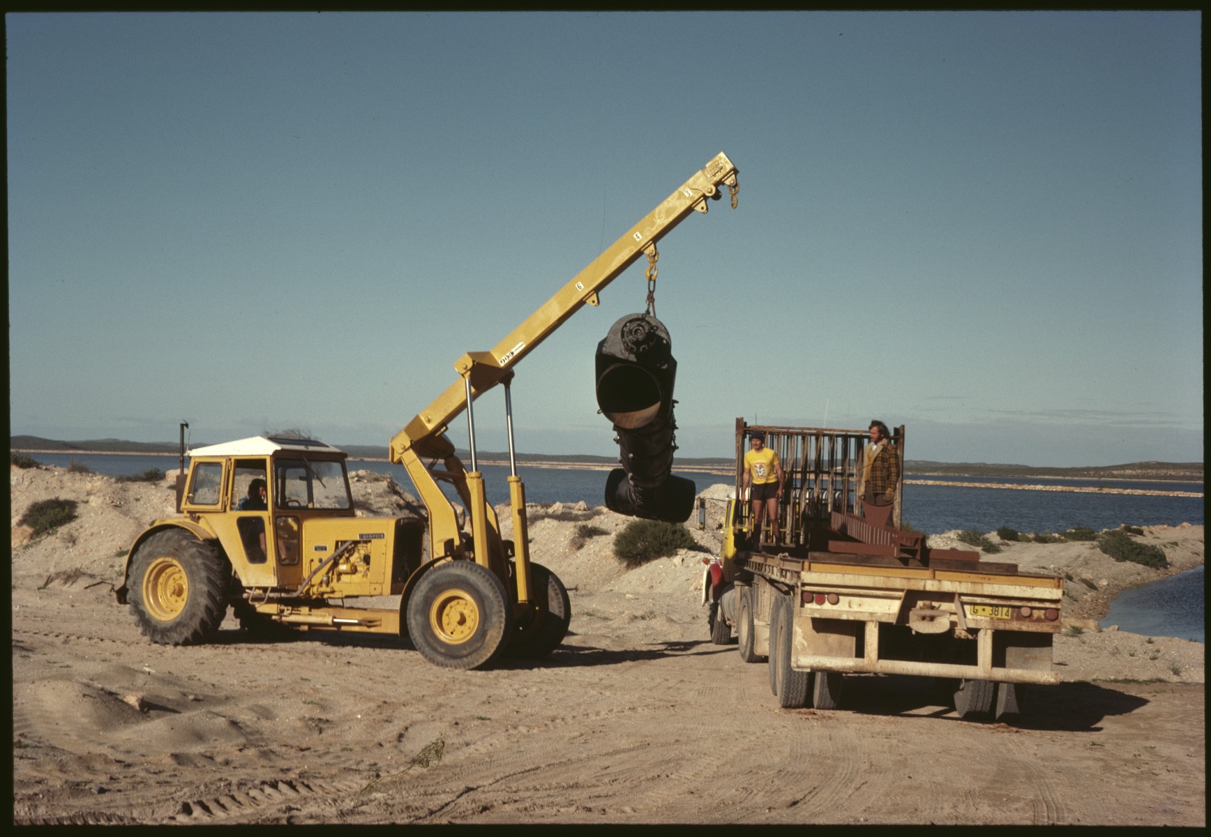 196332PD: Loading or unloading equipment from truck, Useless Loop, Western Australia, August 1980.