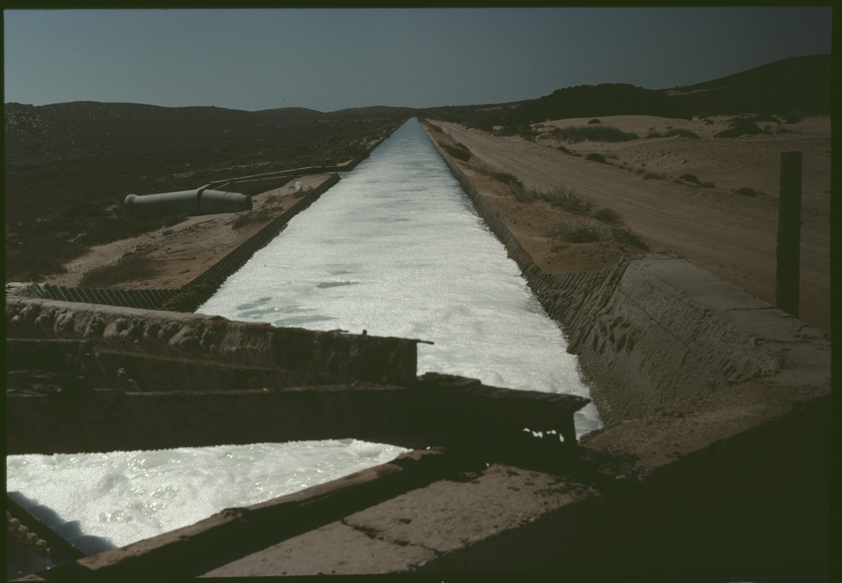 196346PD: Flume from inlet pumps to salt ponds, Useless Loop, Western Australia, April 1981.