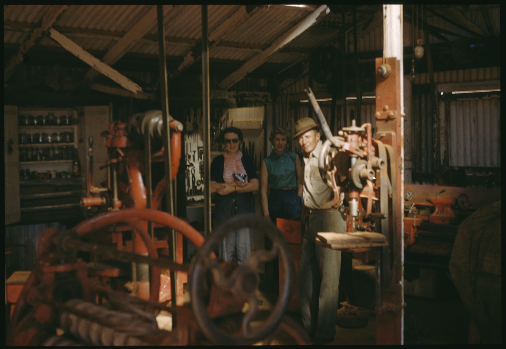 300442PD: Le Souef family members in shed at Minderoo, probably with Don Forrest, Western Australia, 1956.